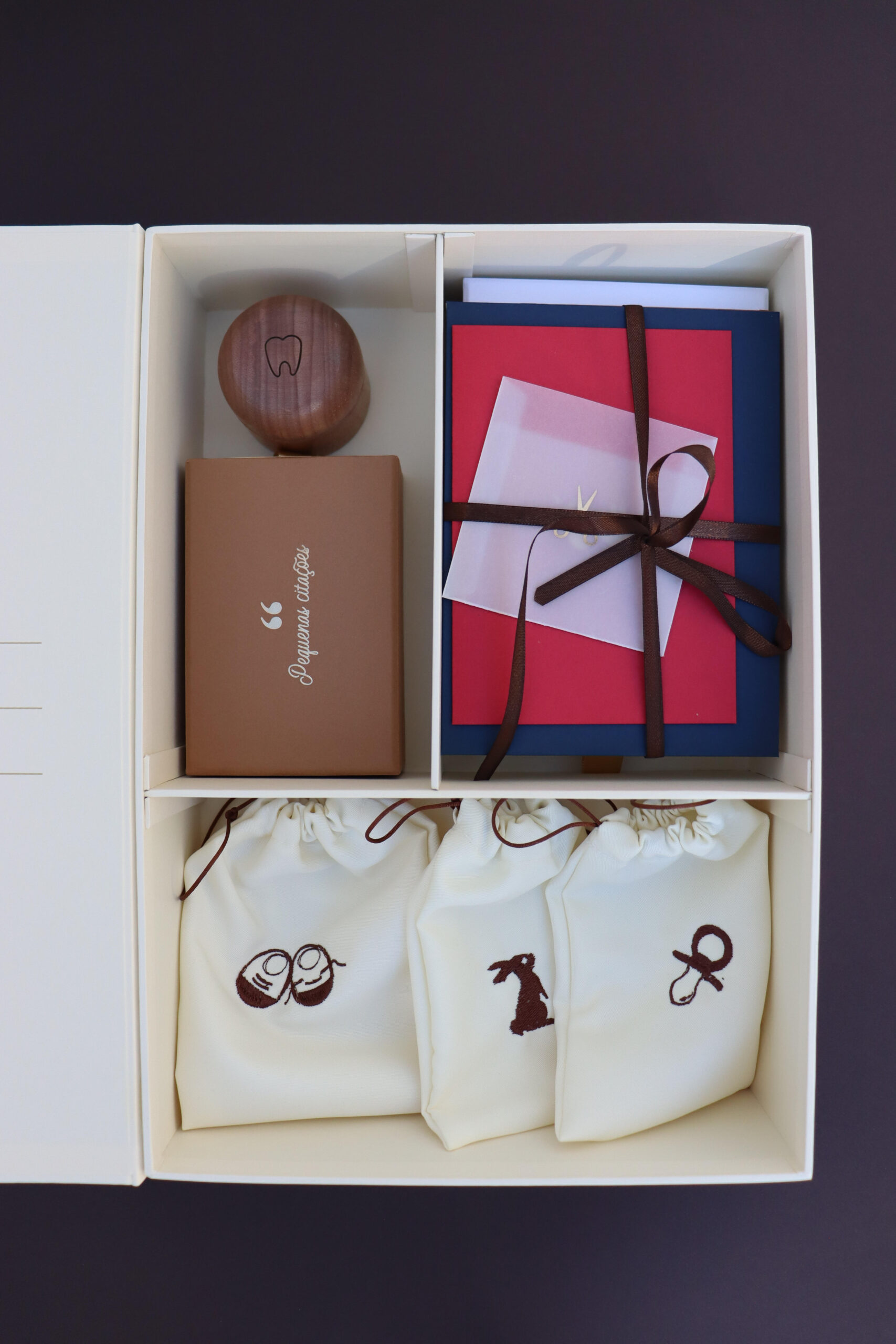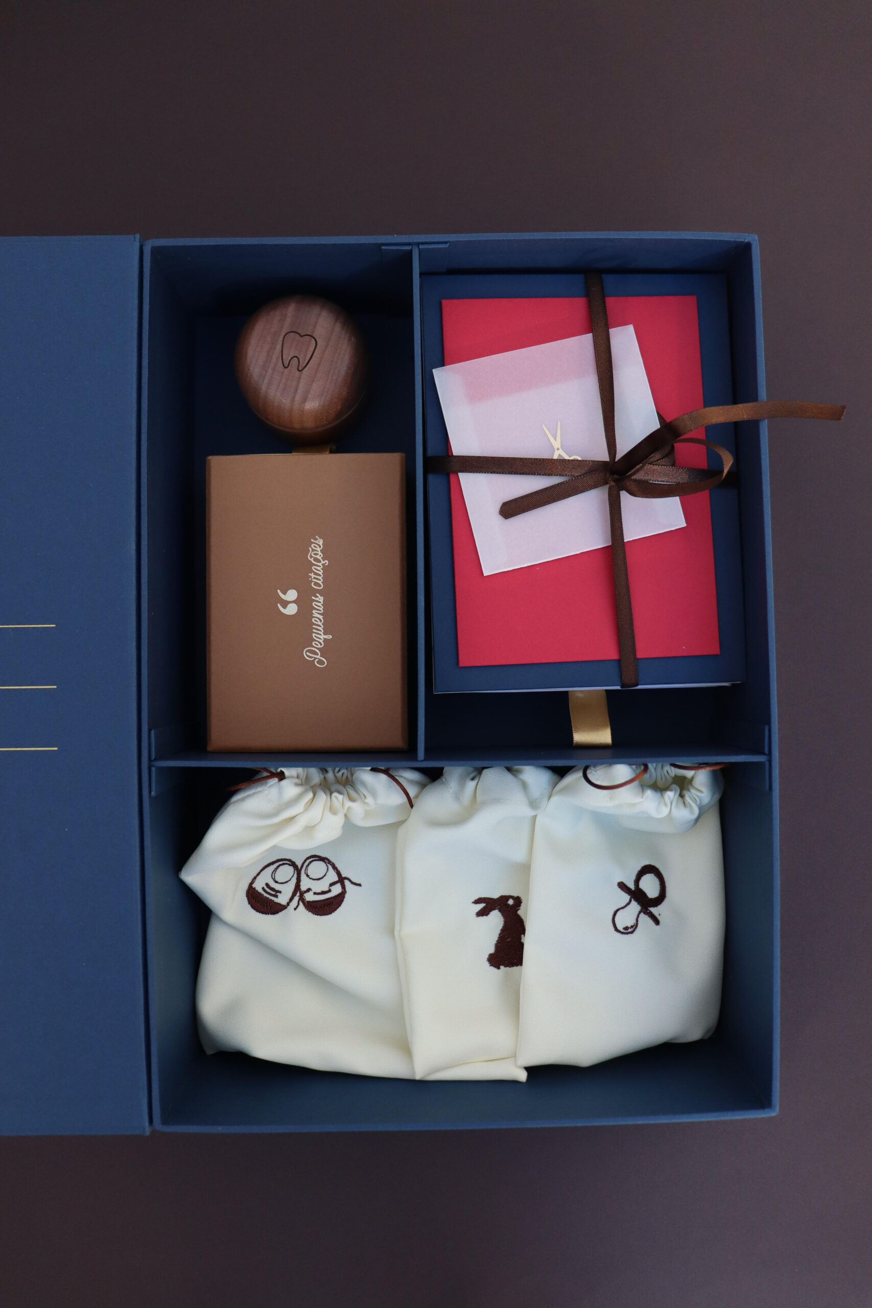 A caixa foi projetada por artesãos experientes e é feita de papel cartonado rígido com acabamento em papel luxuoso com toque sofisticado de linho. Por dentro há compartimentos inteligentemente projetados para acomodar lembranças desde o primiero fio de cabelo até o primeiro dentinho caído e as primeiras frases faladas de uma forma discomplicada. Possui fechamento magnético resistente.