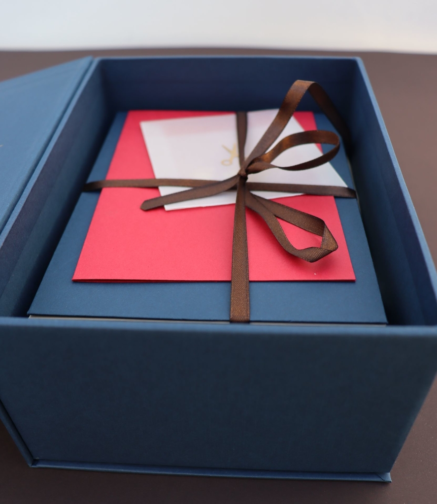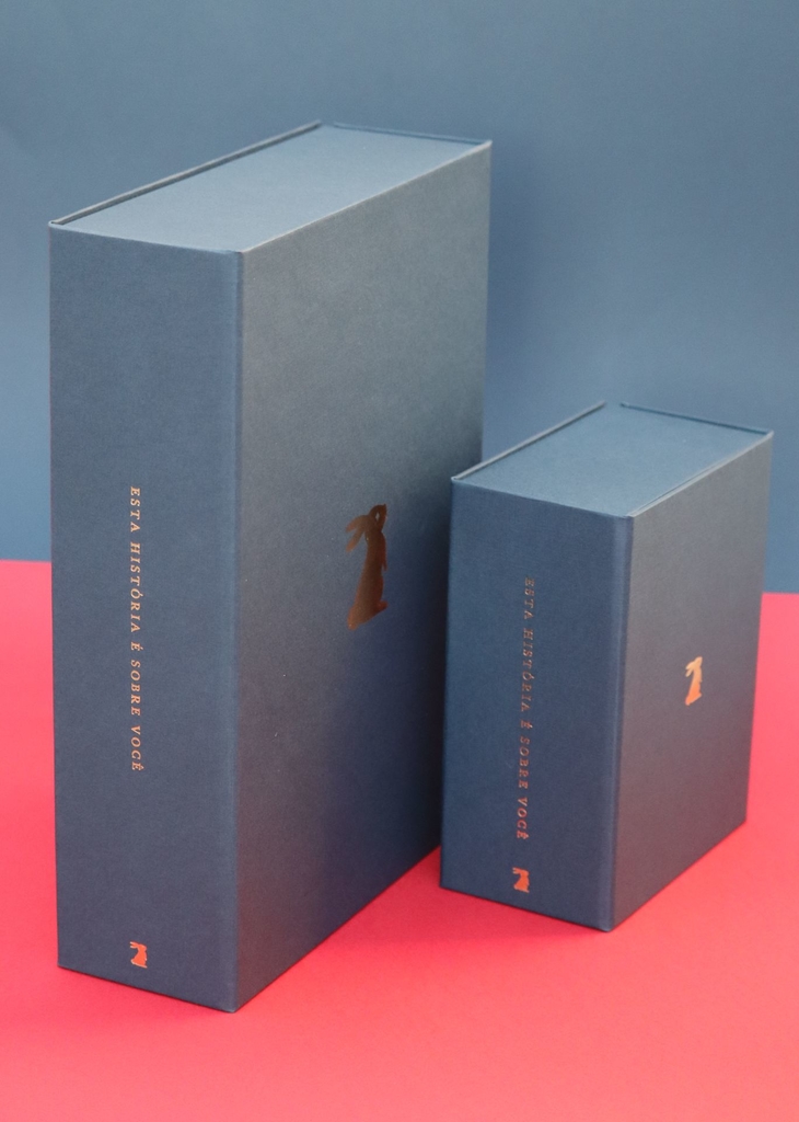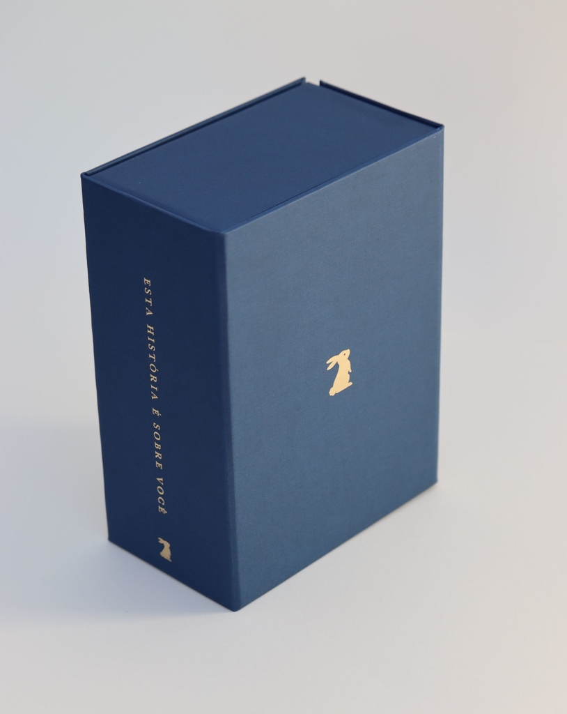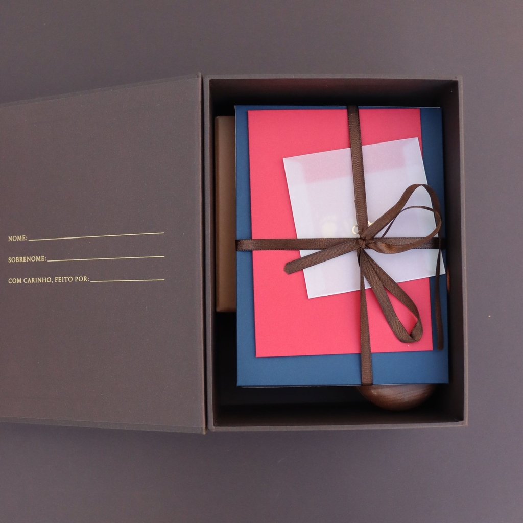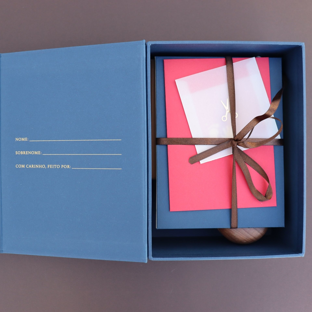 A caixa principal foi projetada por artesãos experientes e é feita de papel cartonado rígido com acabamento em papel luxuoso com toque sofisticado de linho. Há 3 campos para preencher o nome do bebê e dos pais na contracapa. A caixa possui fechamento magnético resistente.